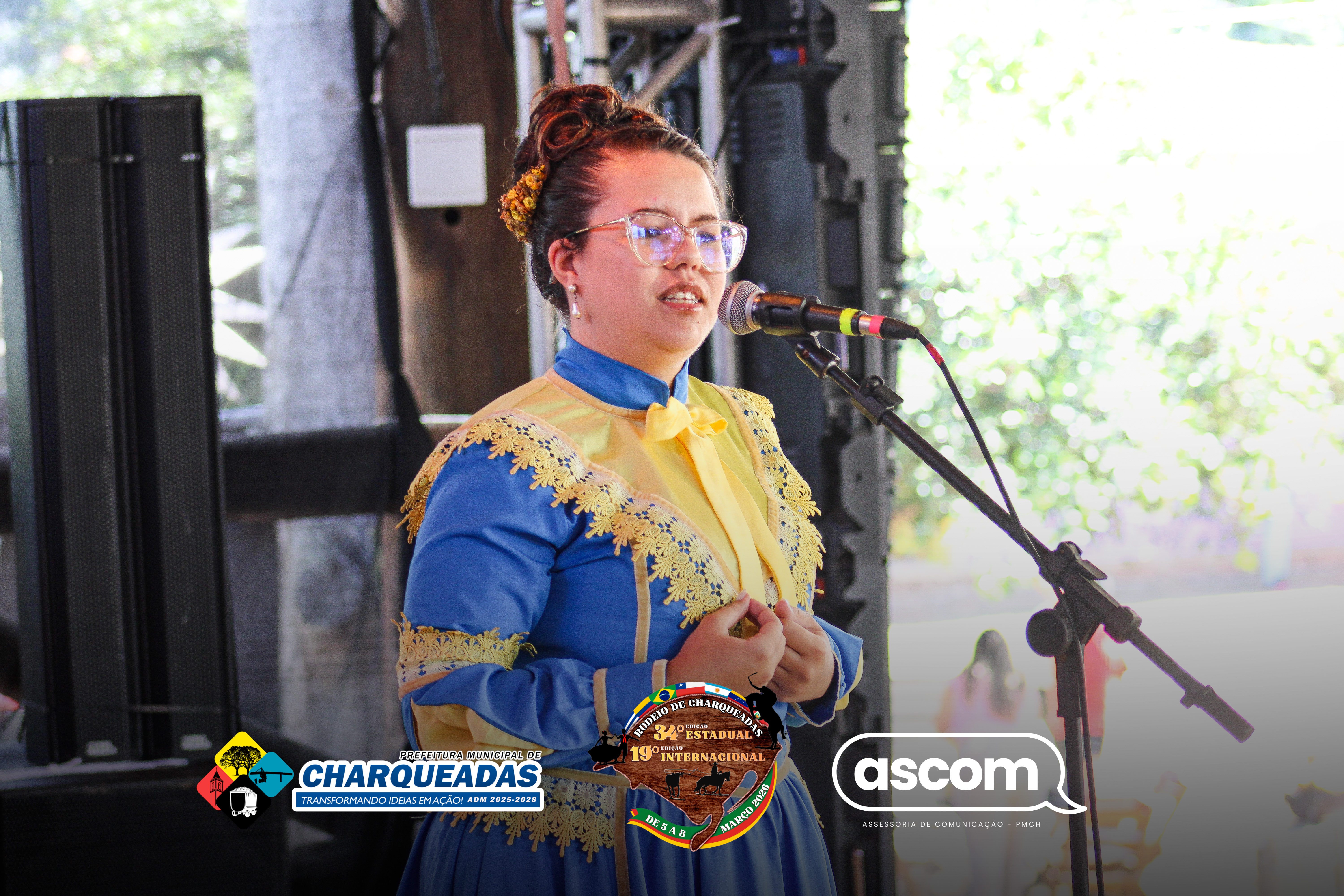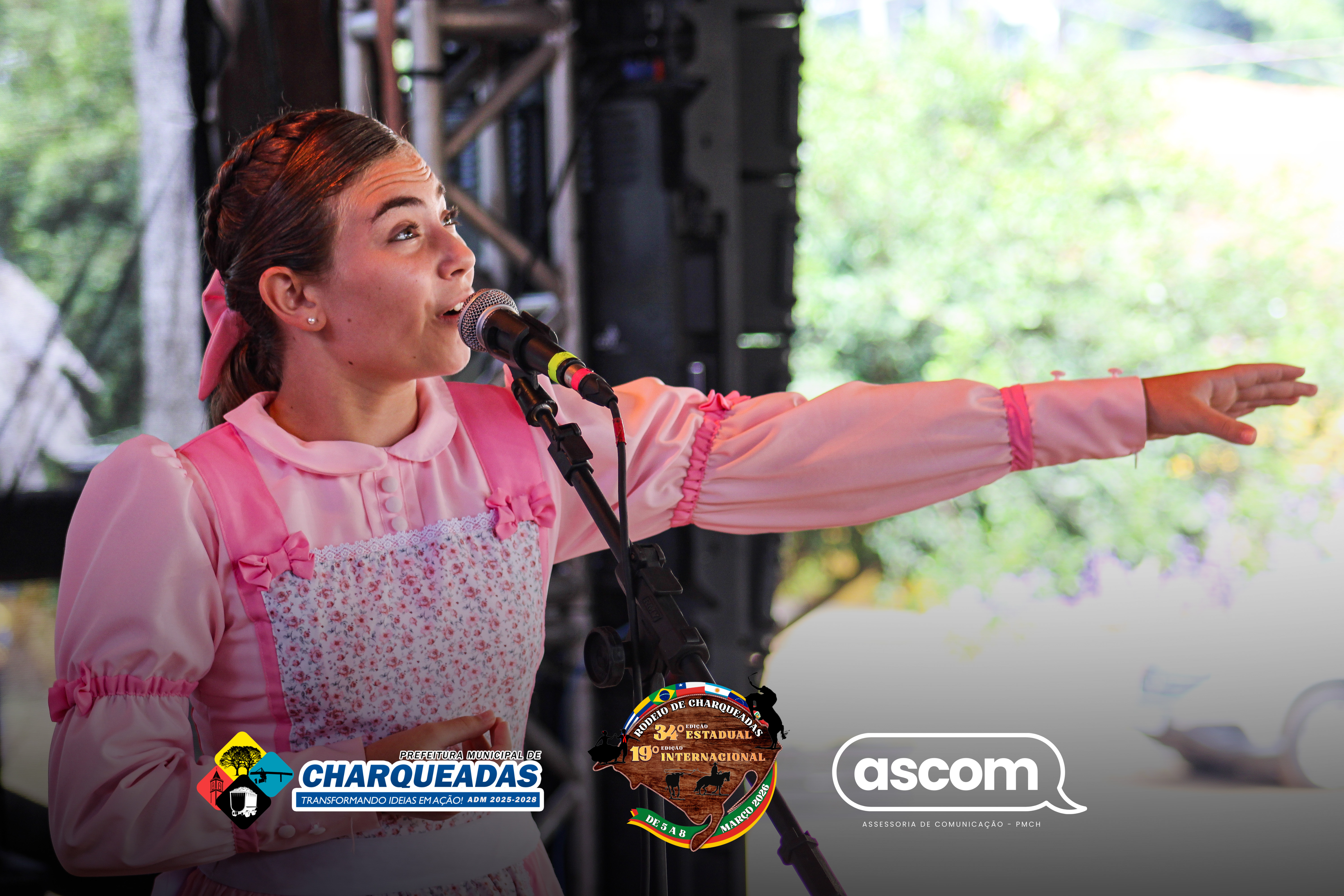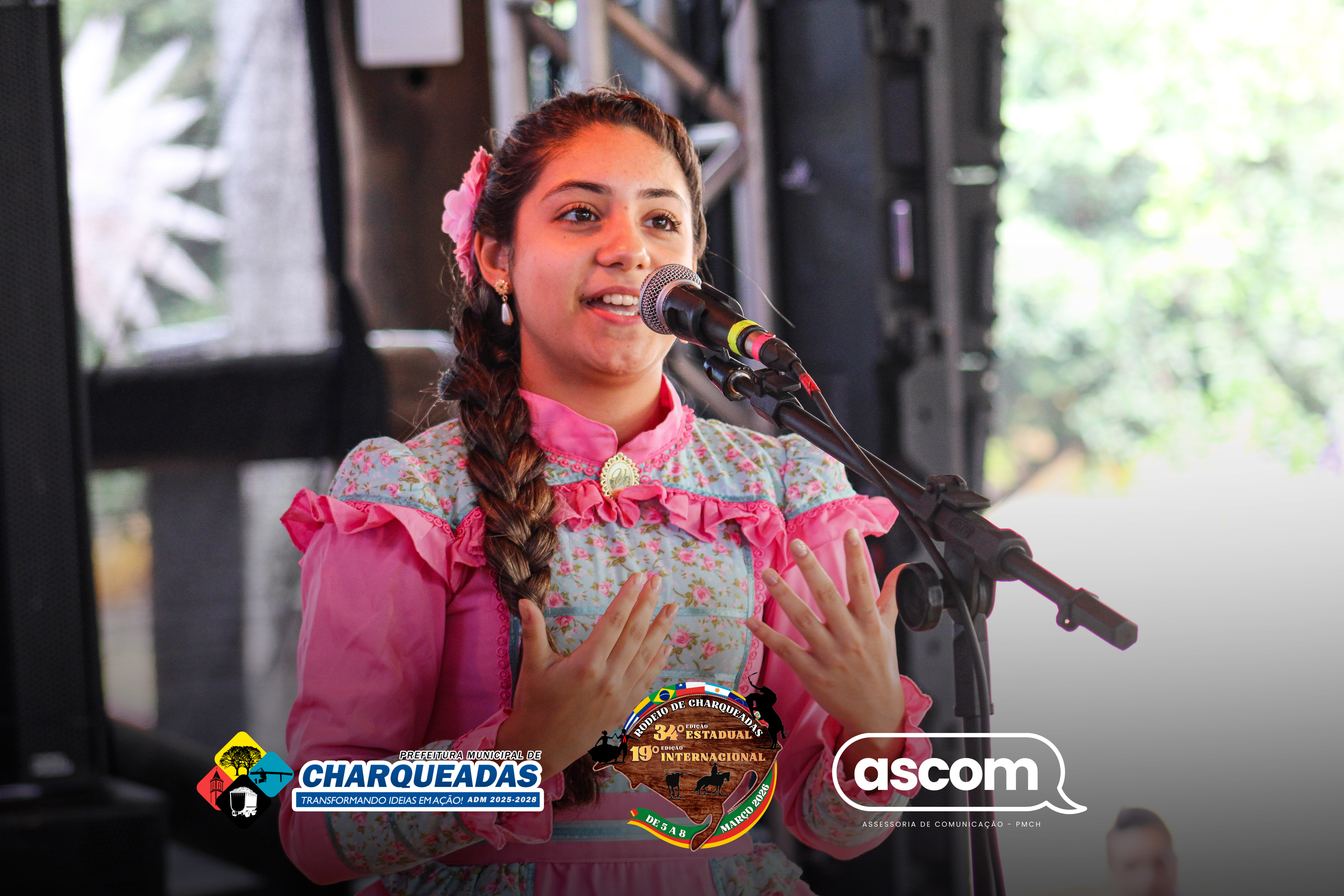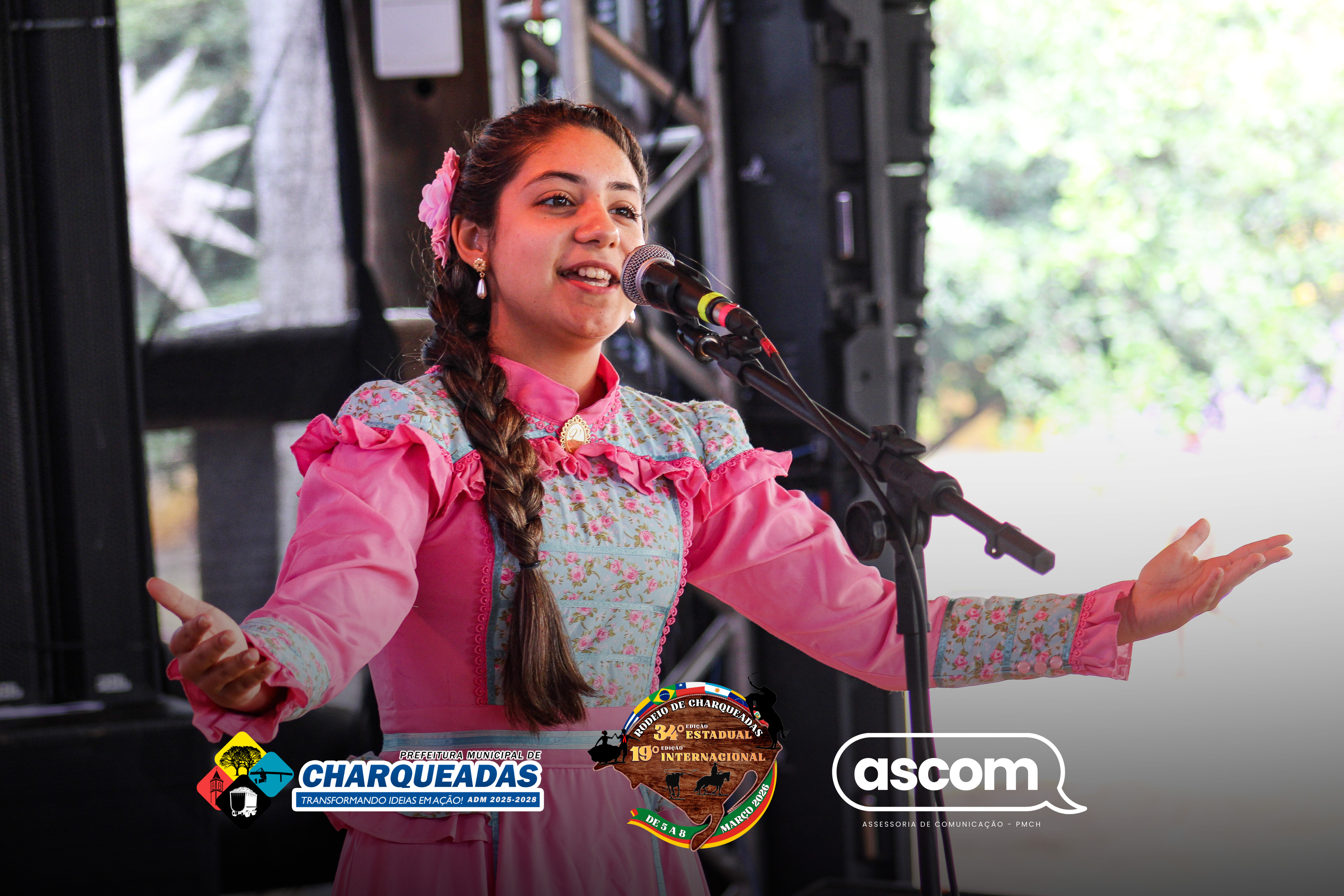 Na tarde deste domingo (08/03), o Parque Municipal de Eventos Aldo Moreira dos Santos foi tomado pelo talento e pela tradição no Concurso de Declamação. Os competidores demonstraram toda sua habilidade e paixão pela música gaúcha, encantando o público presente.